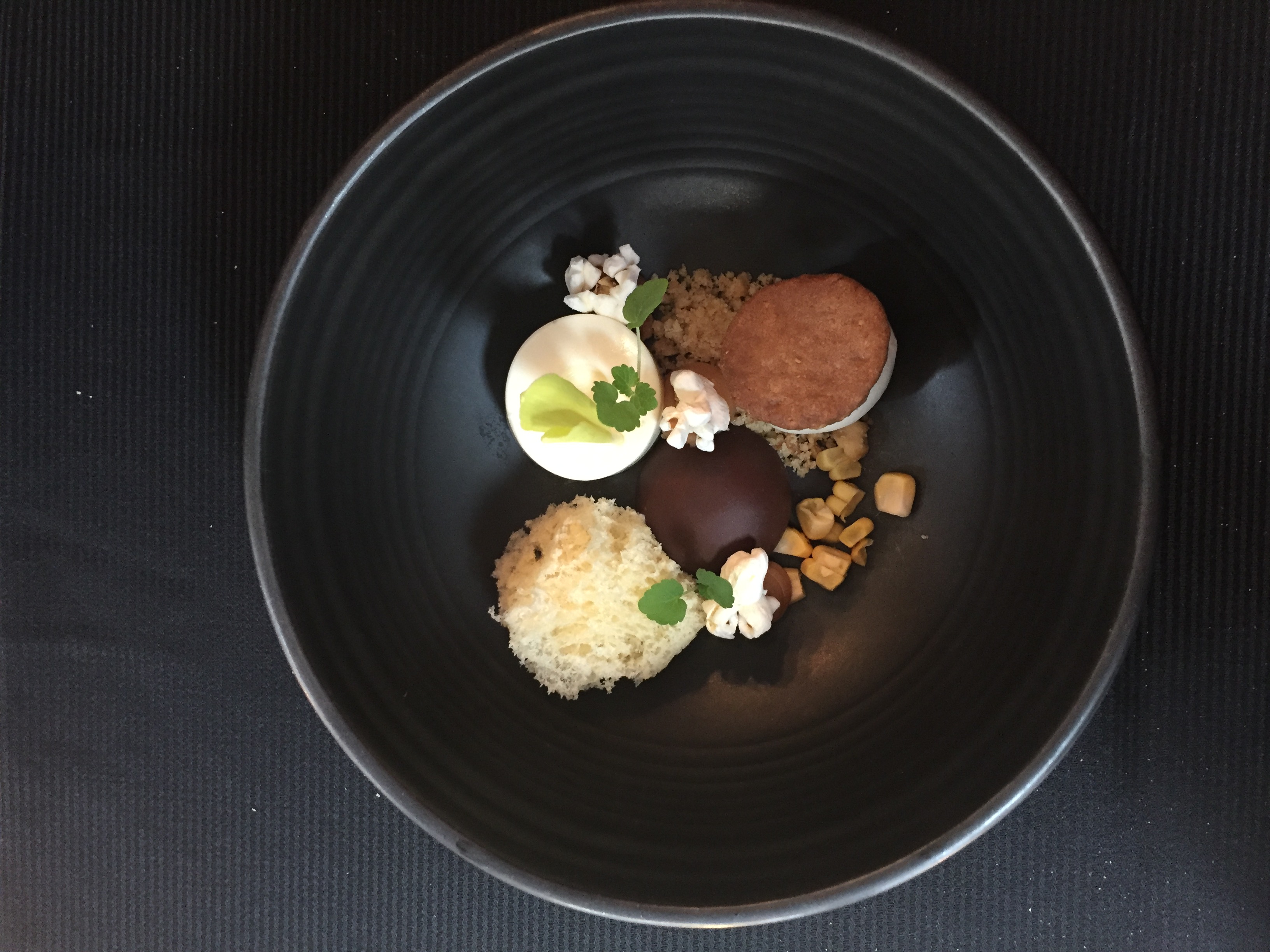 Første ret var rå makrel med spicy mayo og salsa. Haps! Den blev efterfulgt af onglet (nyretap) med små sjove budding-agtige sager med forskellig smag. Og til sidst: Desserten!! En blanding af profiterolles, popcorn-pannacotta og hjemmelavet fyldt chokolade. Er det den bedste dessert, jeg nogensinde har fået? Ja. Det tror jeg sgu.